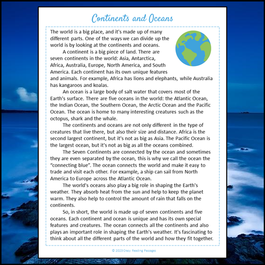 Continents And Oceans Reading Comprehension Passage and Questions | Printable PDF
