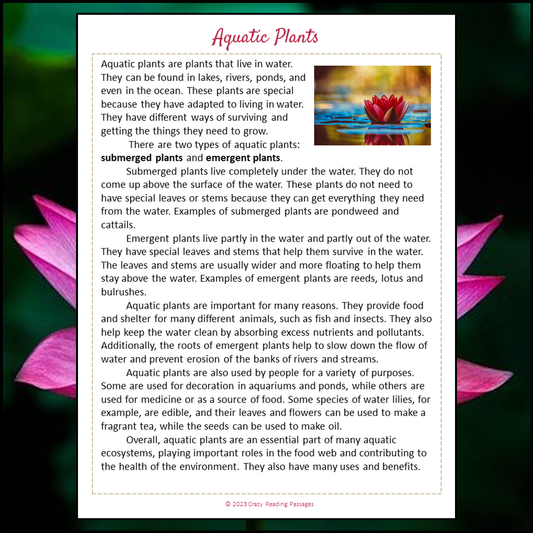 Aquatic Plants Reading Comprehension Passage and Questions | Printable PDF