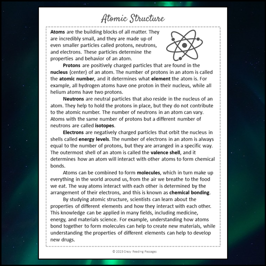 Atomic Structure Reading Comprehension Passage and Questions | Printable PDF