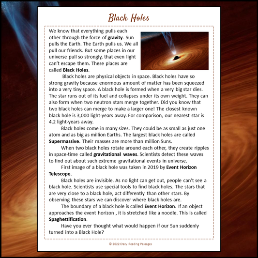 Black Holes Reading Comprehension Passage and Questions | Printable PDF