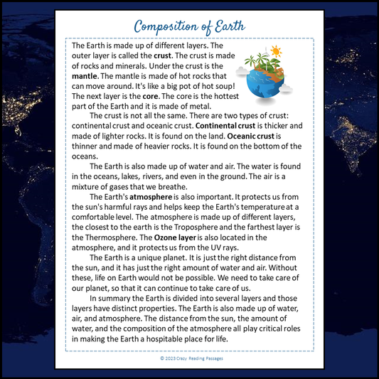 Composition Of Earth Reading Comprehension Passage and Questions | Printable PDF
