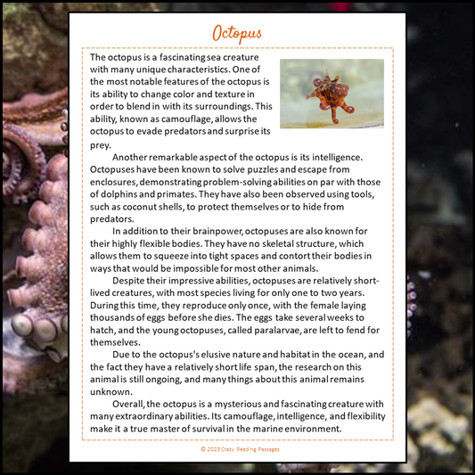 Octopus Reading Comprehension Passage and Questions | Printable PDF