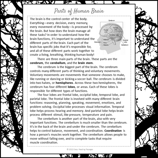Parts Of Human Brain Reading Comprehension Passage and Questions | Printable PDF