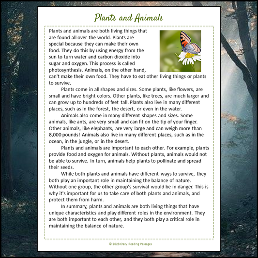 Plants And Animals Reading Comprehension Passage and Questions | Printable PDF