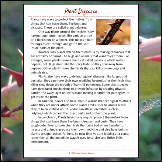 Plant Defenses Reading Comprehension Passage and Questions | Printable PDF