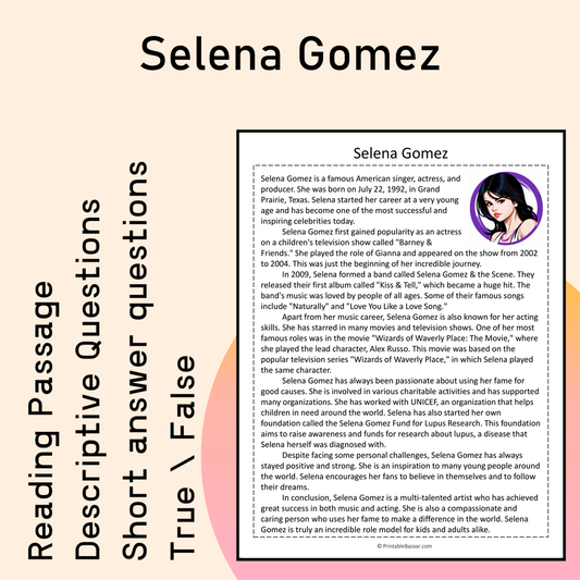 Selena Gomez | Reading Comprehension Passage Printable Activity