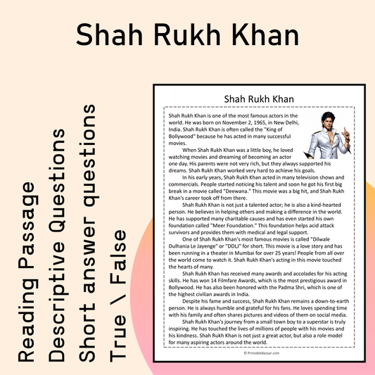Shah Rukh Khan | Reading Comprehension Passage Printable Activity