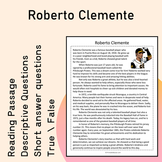 Roberto Clemente | Reading Comprehension Passage Printable Activity