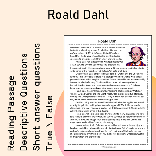 Roald Dahl | Reading Comprehension Passage Printable Activity