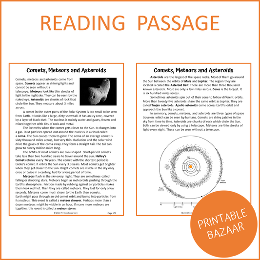 Comets, Meteors and Asteroids Reading Comprehension Passage and Questions | Printable PDF