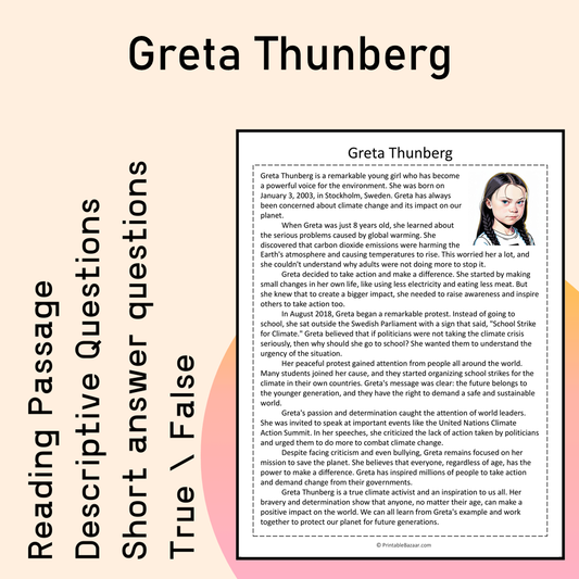 Greta Thunberg | Reading Comprehension Passage Printable Activity