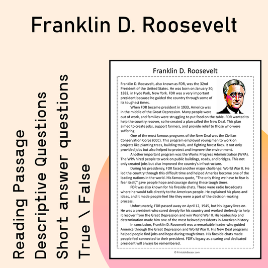 Franklin D. Roosevelt | Reading Comprehension Passage Printable Activity