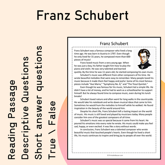 Franz Schubert | Reading Comprehension Passage Printable Activity