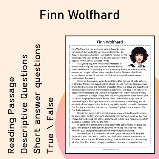 Finn Wolfhard | Reading Comprehension Passage Printable Activity