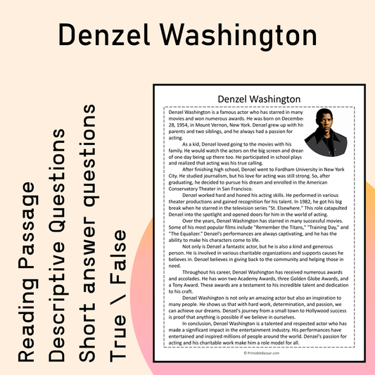 Denzel Washington | Reading Comprehension Passage Printable Activity