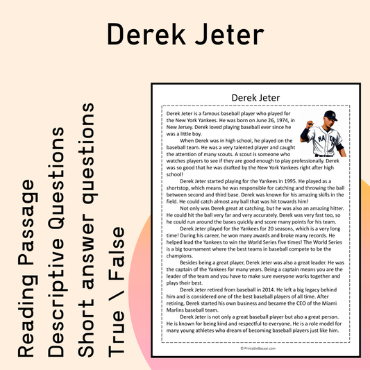 Derek Jeter | Reading Comprehension Passage Printable Activity