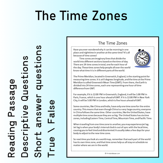 The Time Zones | Reading Comprehension Passage Printable Worksheet