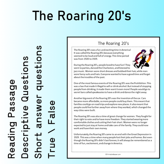 The Roaring 20's | Reading Comprehension Passage Printable Worksheet