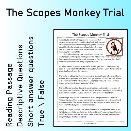 The Scopes Monkey Trial | Reading Comprehension Passage Printable Worksheet