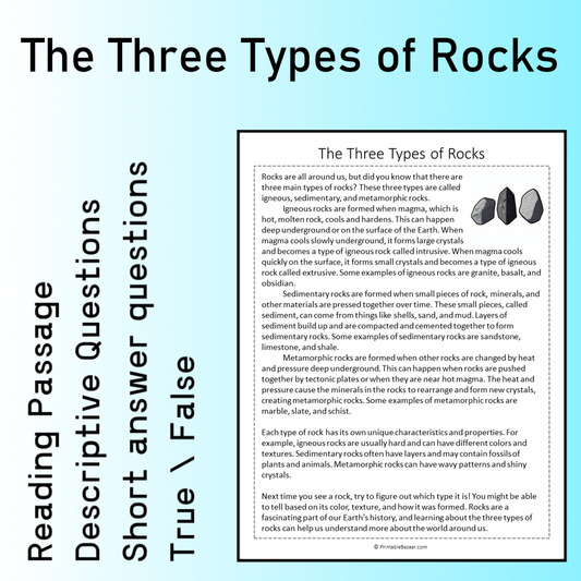 The Three Types of Rocks | Reading Comprehension Passage Printable Worksheet