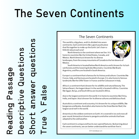 The Seven Continents | Reading Comprehension Passage Printable Worksheet