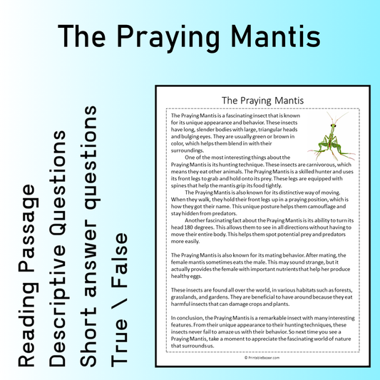 The Praying Mantis | Reading Comprehension Passage Printable Worksheet