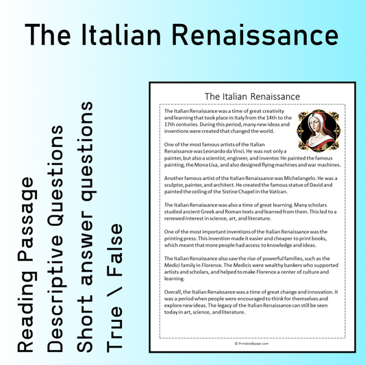 The Italian Renaissance | Reading Comprehension Passage Printable Worksheet