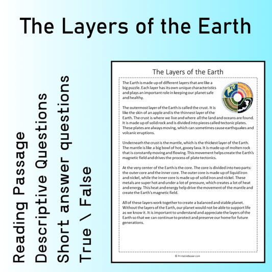 The Layers of the Earth | Reading Comprehension Passage Printable Worksheet
