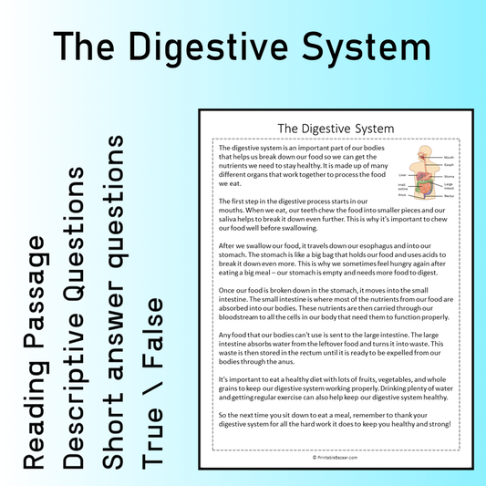 The Digestive System | Reading Comprehension Passage Printable Worksheet