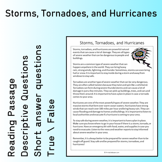 Storms, Tornadoes, and Hurricanes | Reading Comprehension Passage Printable Worksheet