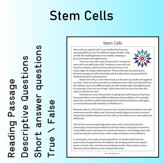 Stem Cells | Reading Comprehension Passage Printable Worksheet