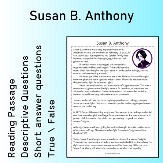 Susan B. Anthony | Reading Comprehension Passage Printable Worksheet