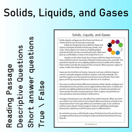 Solids, Liquids, and Gases | Reading Comprehension Passage Printable Worksheet