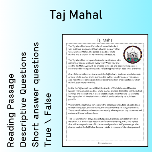 Taj Mahal | Reading Comprehension Passage Printable Worksheet