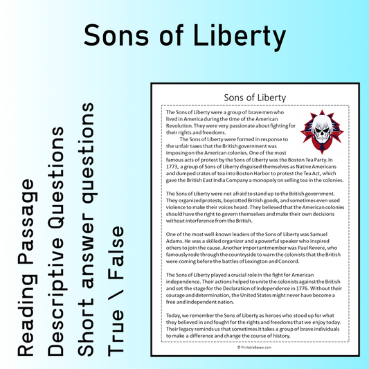 Sons of Liberty | Reading Comprehension Passage Printable Worksheet