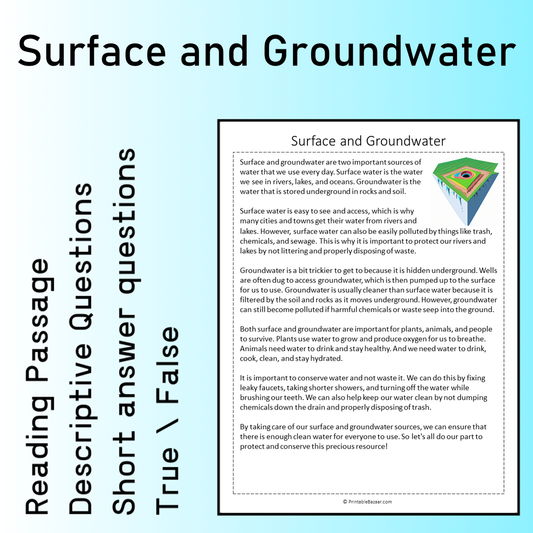 Surface and Groundwater | Reading Comprehension Passage Printable Worksheet