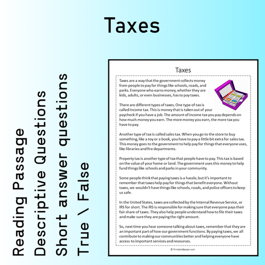 Taxes | Reading Comprehension Passage Printable Worksheet