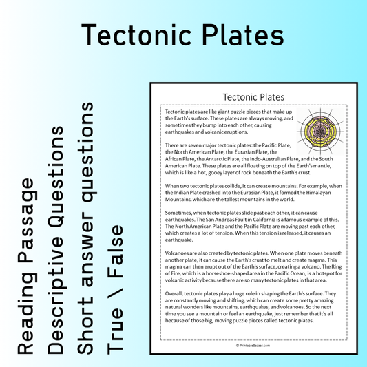 Tectonic Plates | Reading Comprehension Passage Printable Worksheet