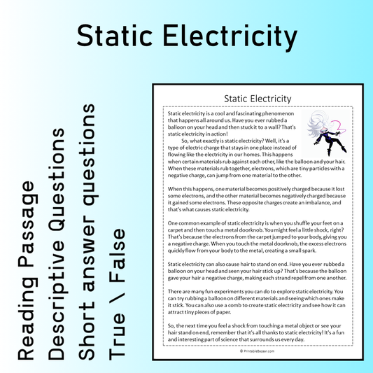 Static Electricity | Reading Comprehension Passage Printable Worksheet