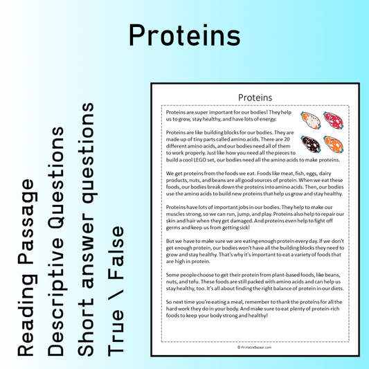 Proteins | Reading Comprehension Passage Printable Worksheet