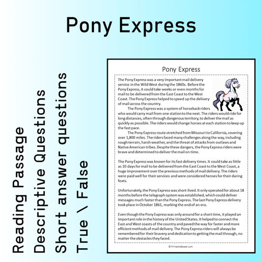 Pony Express | Reading Comprehension Passage Printable Worksheet