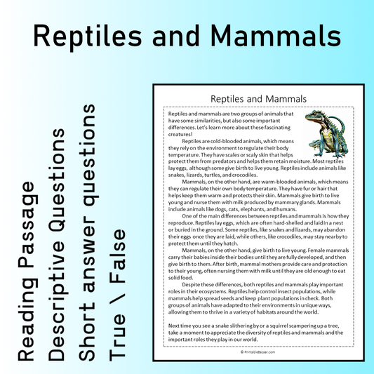 Reptiles and Mammals | Reading Comprehension Passage Printable Worksheet