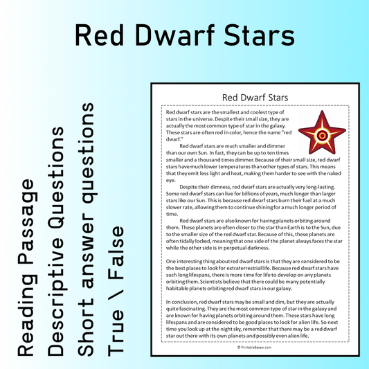 Red Dwarf Stars | Reading Comprehension Passage Printable Worksheet