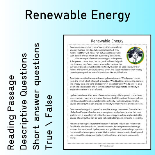 Renewable Energy | Reading Comprehension Passage Printable Worksheet