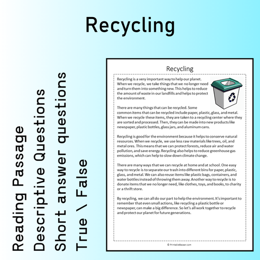 Recycling | Reading Comprehension Passage Printable Worksheet