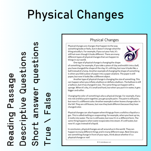 Physical Changes | Reading Comprehension Passage Printable Worksheet