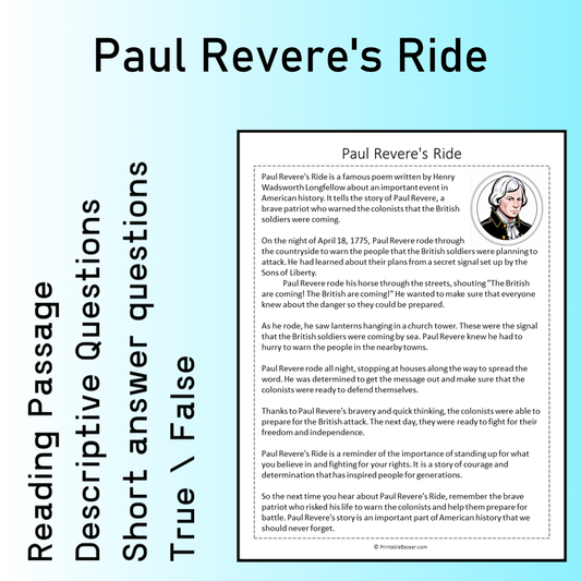Paul Revere's Ride | Reading Comprehension Passage Printable Worksheet