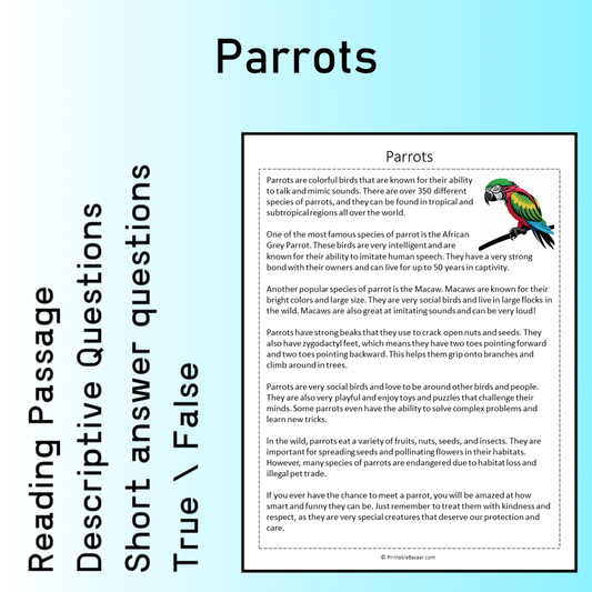 Parrots | Reading Comprehension Passage Printable Worksheet