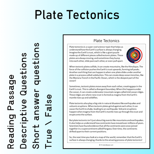 Plate Tectonics | Reading Comprehension Passage Printable Worksheet