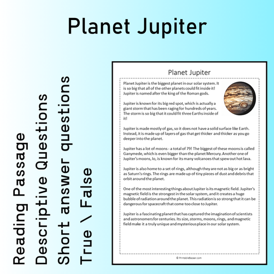 Planet Jupiter | Reading Comprehension Passage Printable Worksheet